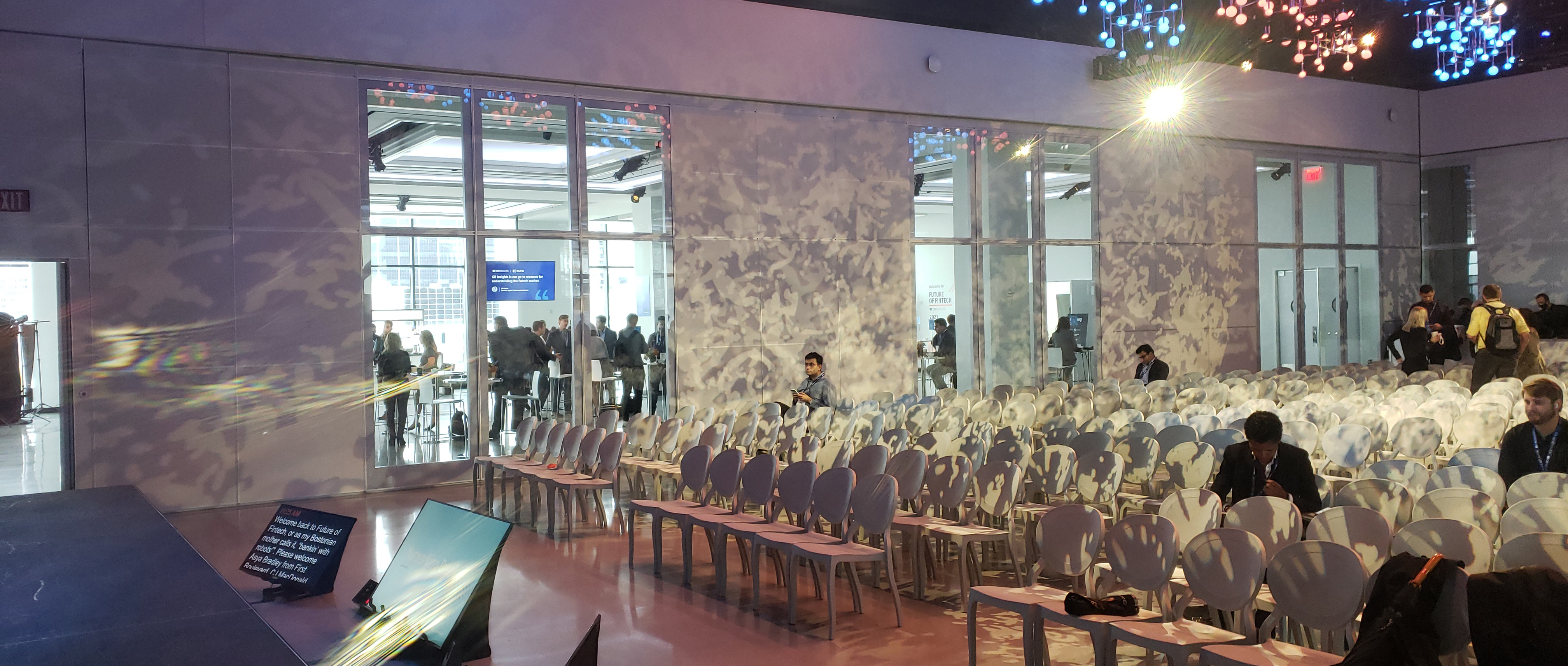 The Glasshouse is a 35,000 sq. ft all exterior glass wall event space overlooking the Hudson River in Manhattan. The Design Team wished to maintain this exterior view from within by using a 15’ tall moveable acoustic glass wall system: let the outside in. This design objective required solid acoustic panels and glass panels that could be interchanged freely in order to configure the meeting areas as dictated by specific requirements. This need required the design and installation of a fool proof grid of intersecting overhead track & intersections (2200 lineal feet), special width solid and glass panels (3 widths) and a flexible expandable panel closure system. As an overhead track structural steel was not part of the initial project design the Moderco distributor, Value Added Group, designed and installed a completesteel strut support system.